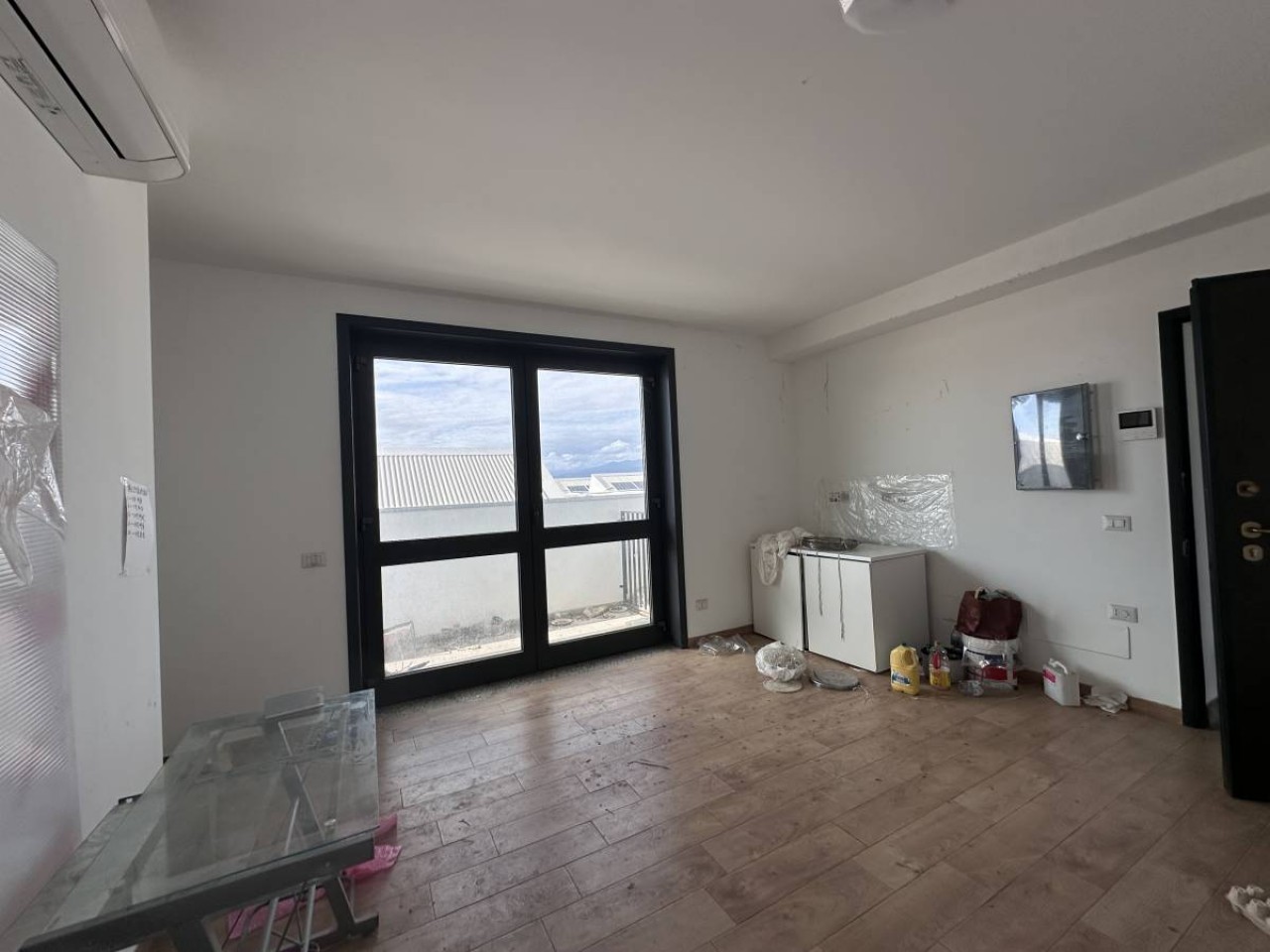Capannone industriale di 1.000 mq., nuovo con altezza 9 mt. con doppie entrate, disponibile subito, luminosissimo, climatizzato, fornito di 2 bagni con antibagno e doccia. Al piano superiore troviamo gli uffici di 140 mq. con bagno, funzionali e luminosi. Pavimenti in cemento industriale e in gres porcellanato. Entrando da una porta indipendente adiacente, si accede all´appartamento di 150 mq. posto sopra al capannone ed č composto da soggiorno, cucina, bagno e tre camere, il tutto molto luminoso e ben rifinito, la comoditā di avere una casa accogliente sopra il luogo di lavoro. Sul fronte spazioso piazzale condominiale.