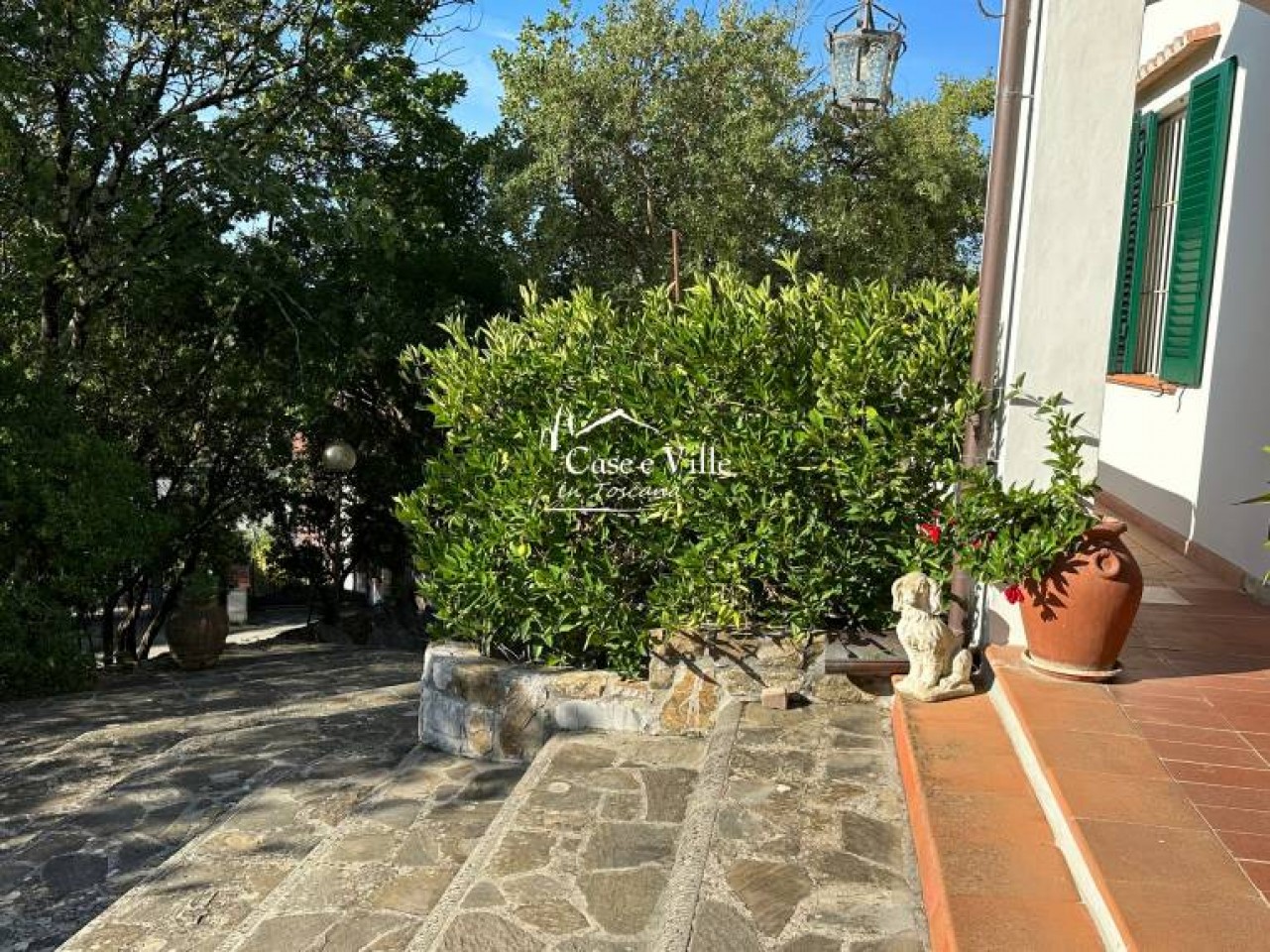 Bella villa in posizione dominante in una tranquilla zona residenziale circondata da parco privato di 5000 mq. La parte principale della casa è disposta su un unico piano di circa 200 mq con ampi spazi che accolgono il salone con camino, uno studio, una grande sala da pranzo e la cucina abitabile. Nella zona notte troviamo 3 camere doppie e due bagni. Ottima dimensione per essere vissuta completamente ed in maniera incredibilmente comoda-. Da tutte le stanze si accede all´esterno con la possibilità di vivere pienamente le terrazze, la veranda coperta adibita a living, ed il giardino.